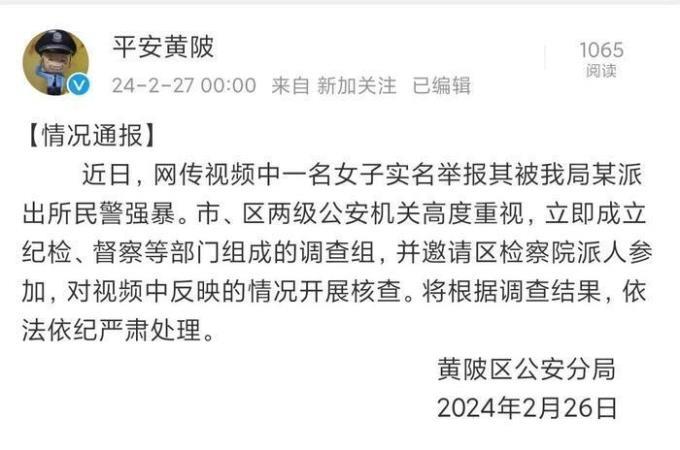 武汉警方通报“女子举报被派出所民警强奸”:成立调查组核查