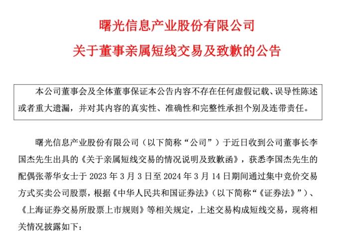 同日,中科曙光(603019.SH,市值650亿元)公告,近日收到公司董事长李国杰出具的《关于亲属短线交易的情况说明及致歉函》,获悉李国杰的配偶张蒂华于2023年3月3日至2024年3月14日期间通过集中竞价交易方式买卖公司股票,上述交易构成短线交易。