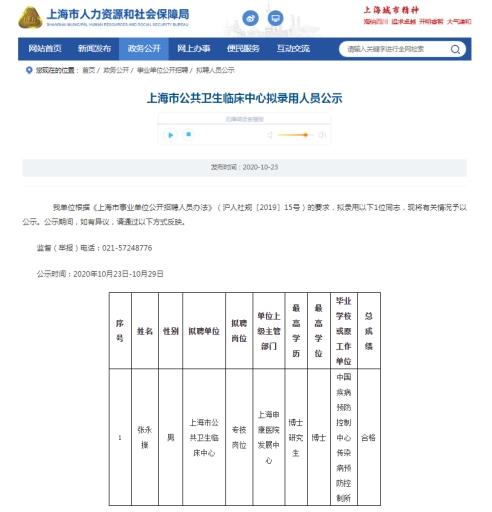 张永振说,2020年上海公卫临床中心希望聘任他全职工作。当年,上海公卫中心与中疾控传染病预防控制所协商一致,把他调到上海公卫中心全职工作,并获党委会通过。红星新闻在上海市人社局官网注意到2020年10月的一则上海市公共卫生临床中心拟录用人员公示,拟录用张永振,拟聘岗位为“专技岗位”。
