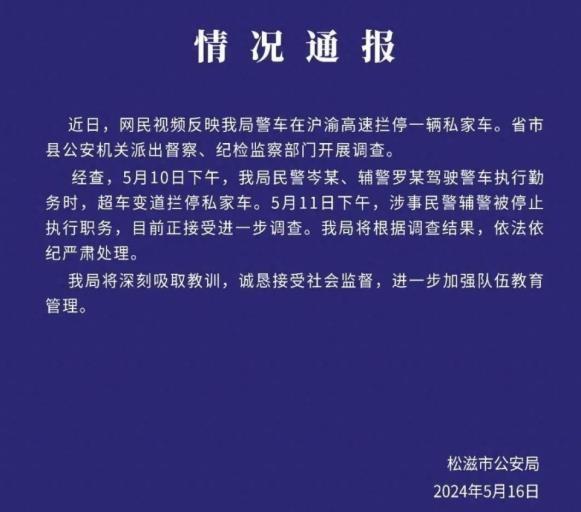 经查,5月10日下午,我局民警岑某、辅警罗某驾驶警车执行勤务时,超车变道拦停私家车。5月11日下午,涉事民警辅警被停止执行职务,目前正接受进一步调查。我局将根据调查结果,依法依纪严肃处理。