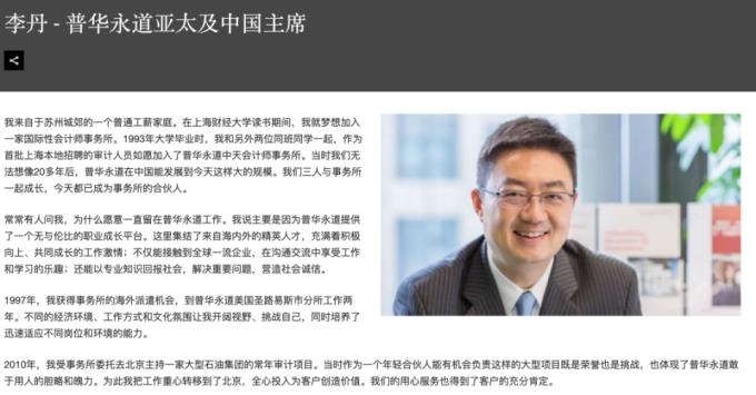 据普华永道中国官网,李丹是首位领导国际四大专业服务公司在华业务的中国内地人士。