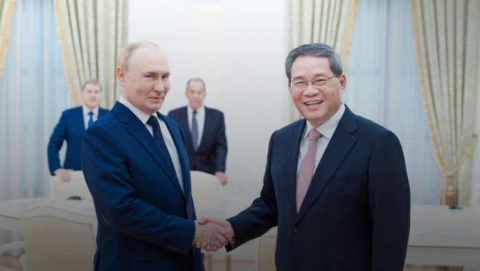 李强首先转达习近平主席对普京总统的亲切问候和良好祝愿。李强表示,今年以来,两国元首两度会晤,在中俄建交75周年的历史节点上,为进一步深化双边关系与合作擘画新的蓝图、注入强劲动力。中俄关系稳定发展,不仅符合两国和两国人民的根本利益,也有利于地区乃至世界的和平、稳定、繁荣。中方愿同俄方一道,落实好两国元首重要共识,保持双边关系良好发展势头,不断拓展全方位互利合作,取得更多务实成果。