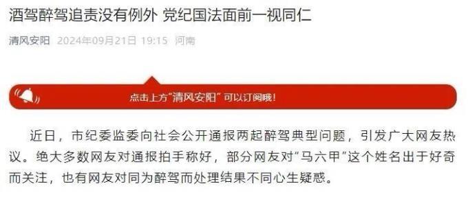 9月21日,“清风安阳”公众号发布《酒驾醉驾追责没有例外 党纪国法面前一视同仁》。9月10日,安阳市纪委监委向社会公开通报两起醉驾典型问题,引发广大网友热议。其中,汤阴县任固镇政府原事业编制工勤人员马六甲、安阳市城市管理局龙安大队(分局)副大队长(副局长)范晓东均是醉驾,马六甲被法院判处拘役二个月,并受到开除公职处分;范晓东则是受到党内严重警告、政务记大过处分。
