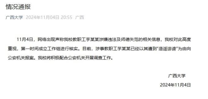 广西大学11月4日晚发布情况通报称,网络出现声称我校教职工芋某某涉嫌违法及师德失范的相关信息,我校对此高度重视,第一时间成立工作组进行核实。