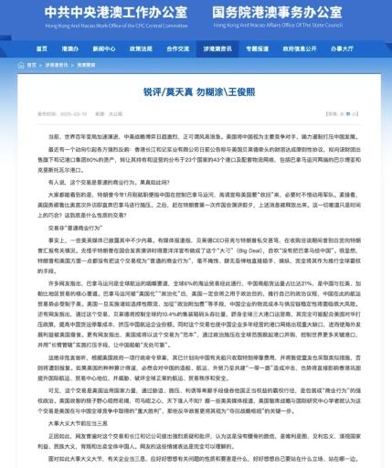 长安街知事(微信ID:Capitalnews)就在几天前的3月13日,国务院港澳办转载一篇针对此事的评论文章《锐评 | 莫天真 勿糊涂》。