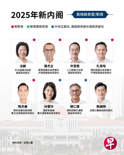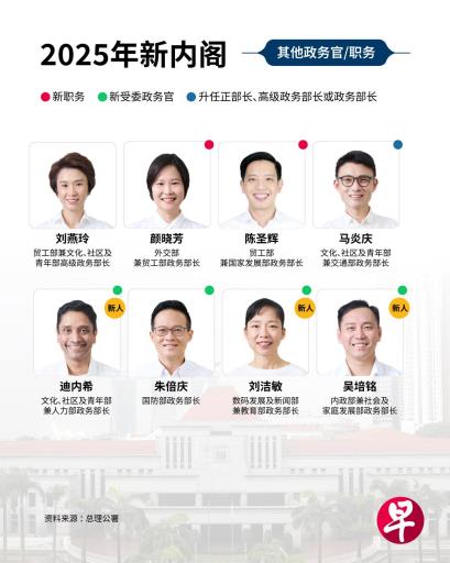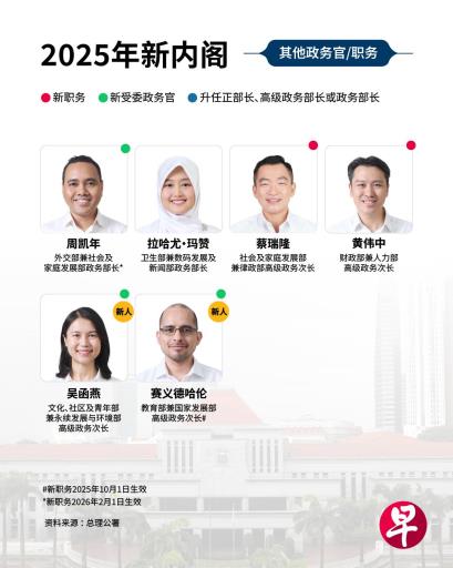此外,黄循财这次也委任了九名新的政务官,是近年来最多的一次。这包括获擢升的后座议员朱倍庆和周凯年,以及新进议员萧振祥、梁振伟、刘洁敏、迪内希、吴培铭、吴函燕和赛义德哈伦医生。