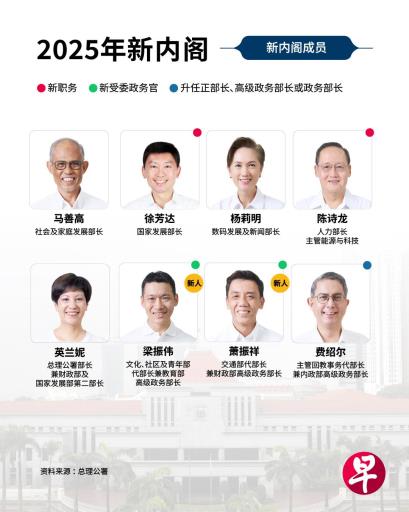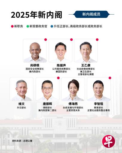 尚穆根接替国务资政张志贤成为国家安全统筹部长、陈振声担任公共服务统筹部长,王乙康则负责社会政策。新人事任命将于星期五(23日)生效。