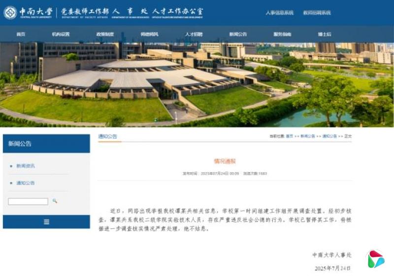 据澎湃新闻报道,被举报的谭某兵为中南大学药学实验教学中心实验师。