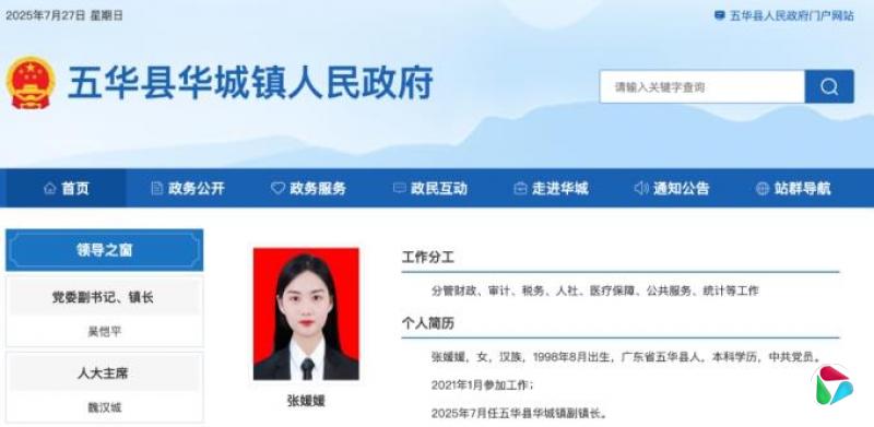 华城镇政府网站“领导之窗”栏目显示,张媛媛,女,汉族,1998年8月出生,广东省五华县人,本科学历,中共党员。2021年1月参加工作,2025年7月任五华县华城镇副镇长。