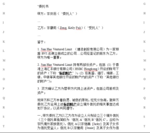 判决书还展示了一份委托书。委托书中提到宗庆后与宗馥莉就运用建浩创投有限公司存放于汇丰银行账户中的17.99亿美元资产设立境外信托的相关事宜达成协议。
