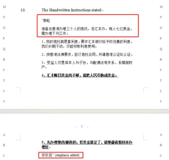判决书中提到一份宗继昌提交的无日期的手写文件,原告称该文件是宗庆后于2024年1月下旬亲笔书写给郭虹的。在这份文件中,宗庆后指示郭虹“准备去香港为三个人办理信托,在汇丰办,每人七亿美金”;当中写到,该信托“长期不动,仅能收取利息使用”。