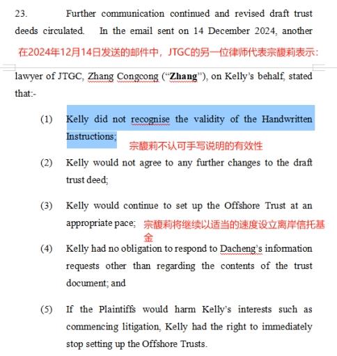 不过,判决书提到,在2024年12月14日发送的邮件中,律师表示宗馥莉并不认同手写文件的有效性,宗馥莉将继续以适当的速度设立离岸信托基金。