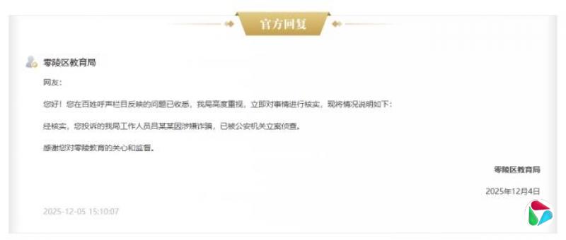 12月4日,永州市零陵区教育局对“投诉零陵区教育局工作人员收钱不办事”回复表示,该局高度重视,立即对事情进行核实。经核实,网友投诉的该局工作人员吕某某因涉嫌诈骗,已被公安机关立案侦查。