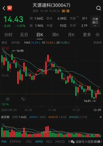 截至12月9日收盘,天源迪科每股报14.43元,下跌1.57%,最新市值为92亿元。