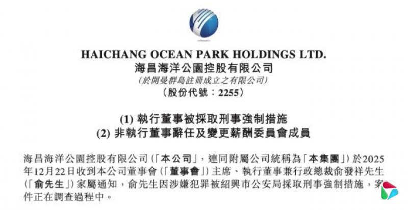 12月22日晚,祥源文旅、交建股份、海昌海洋公园同步发布公告,公司实控人俞发祥因涉嫌犯罪,被绍兴市公安局采取刑事强制措施,案件正在调查过程中。