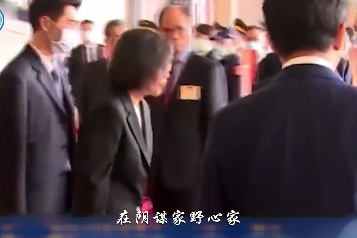 这段旁白在陈述时,不仅搭配蔡英文和赖清德的画面,还包括解放军军机和潜艇行动的画面。