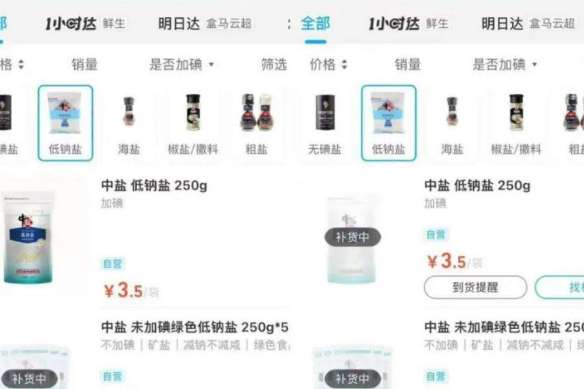 报道引述一名消费者称,网购平台盒马APP的一款低钠盐一分钟前看还有货,再一滑就显示缺货了。