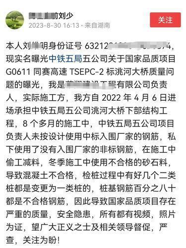 “本人刘某明,现实名曝光中铁五局五公司关于国家品质项目 G0611 同赛高速 TSEPC-2 标段洮河大桥质量问题的曝光,我是实际施工方,我方自2022年4月6日进场承担中铁五局五公司洮河大桥下部结构工程,8个多月的施工中,中铁五局五公司项目负责人未按设计使用中标入围厂家的钢筋,私下使用了没有入围厂家的非标钢筋,在施工中偷工减料,冬季施工中使用不合格的砂石料,导致混凝土不合格,检桩过程中有好几个二类桩都是变更为一类桩的,桩基钢筋大部分都是不合格钢筋,因此导致国家品质项目存在严重的质量、安全隐患,所有都有视频、照片为证……”奔流新闻记者该网友在社交平台发布的举报信下附有相关照片。