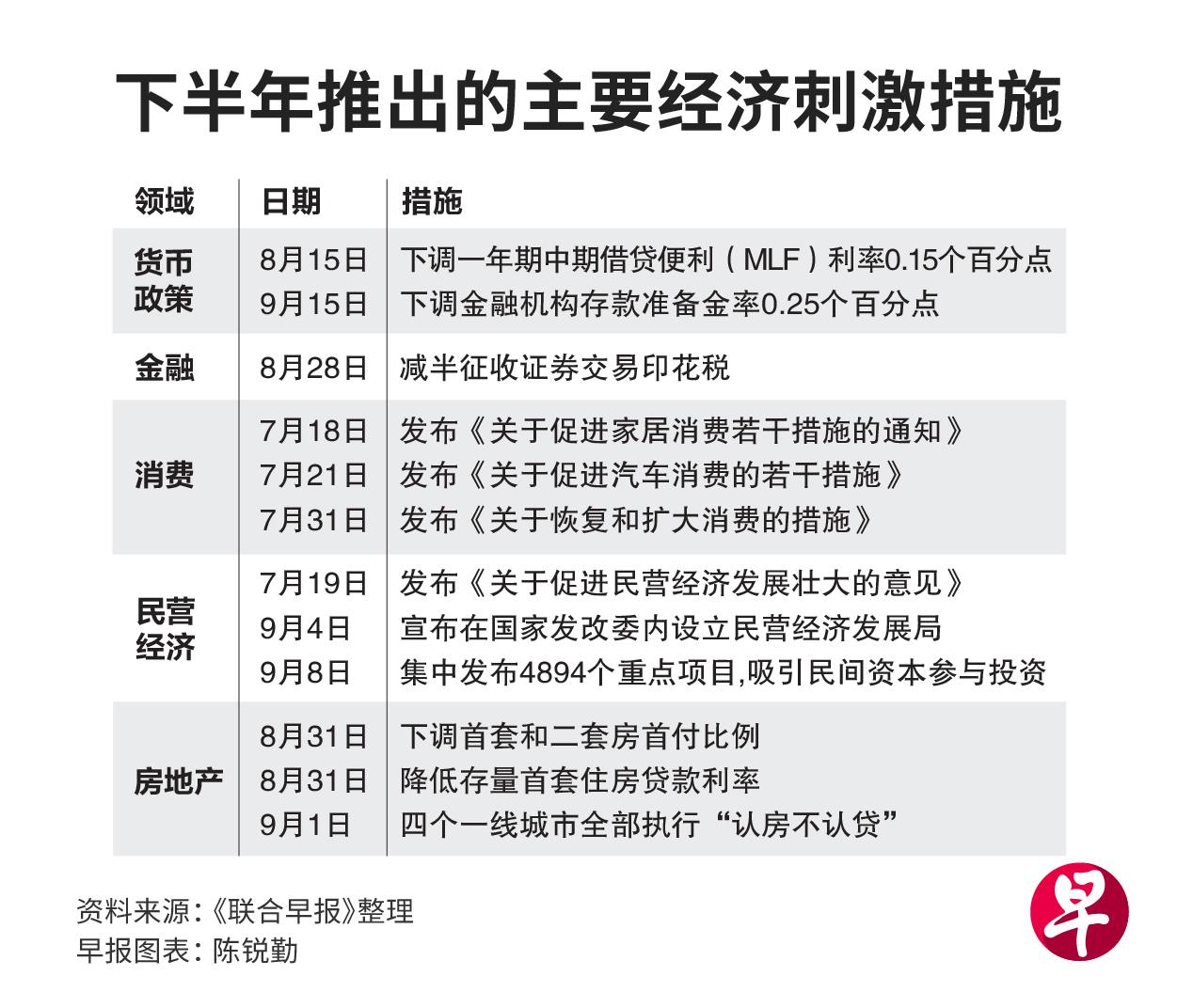 中国官方下半年来密集出台经济刺激政策,从降息降准到放宽限购,涵盖金融、消费、房地产和民间投资等多个领域。8月份经济指标全面回升,工业增加值和零售消费增速均超出预期,出口跌幅也收窄。