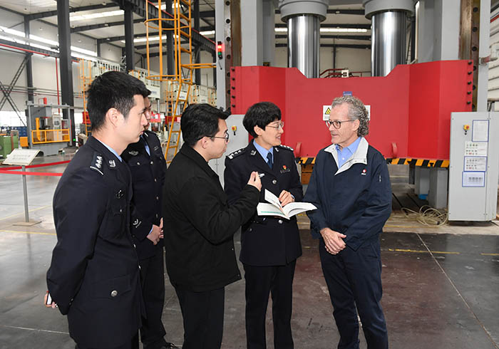 2022年11月22日,在新昌县浙江美力科技股份有限公司,当地出入境管理大队工作人员为一名瑞士籍专家(右一)介绍居留政策。(新华社)