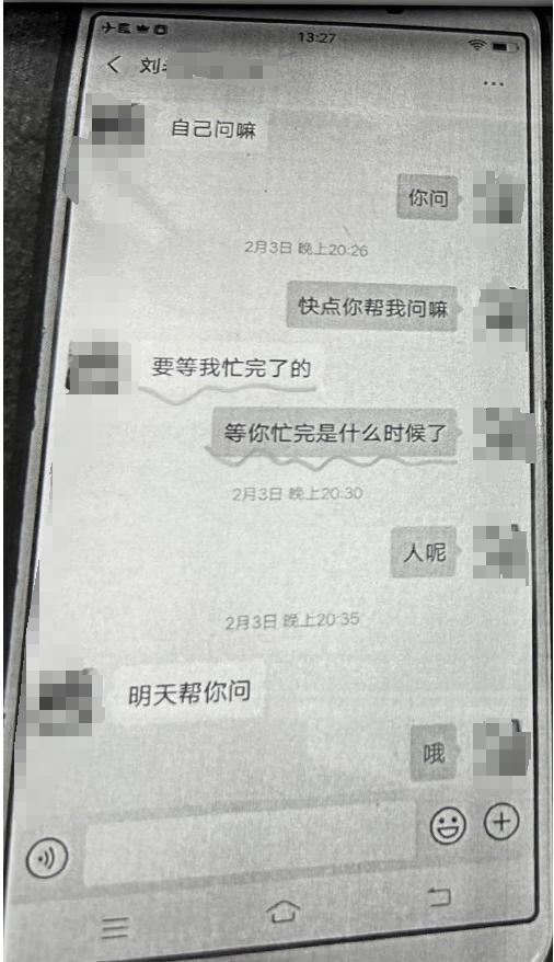 顶端新闻记者从家属处获取的一份刘东和熊心的聊天记录显示,刘东曾多次邀约过熊心。2月4日,熊心出事的前三天,熊心曾发消息给刘东抱怨其不给她找工作,并说自己外婆身体不好,妈妈吐血在医院,“我恨你,现在让我怎么回去,除非我死,为啥老天这样。”