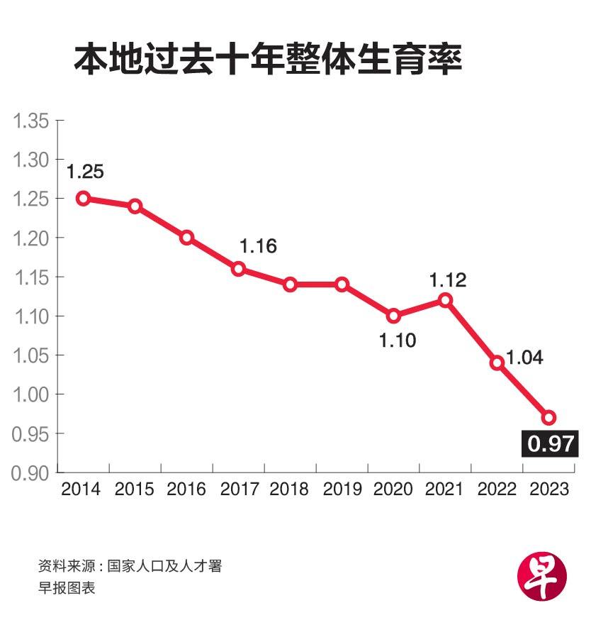 新加坡整体生育率持续下滑,首次跌至1.0以下,远低于2.1的人口替代水平。