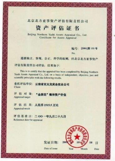 当年,该公司曾委托北京北方亚事资产评估有限责任对这棵名为“永不凋谢的金茶花”进行评估,评估结果为人民币2515.5万元。次年,云南省亚太龙黄金实业公司再次委托云南省第二公证处,对石林工行金茶花摄影部“永不凋谢的金茶花”进行证据保全公证。