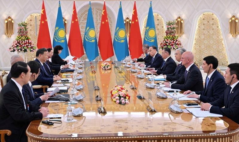 习近平随后与托卡耶夫进行小范围和大范围会谈。习近平说,他此次到访哈萨克斯坦,亲身感受到哈萨克斯坦蒸蒸日上的发展景象,相信在托卡耶夫的领导下,哈萨克人民一定会建成一个富强繁荣的“新哈萨克斯坦”。