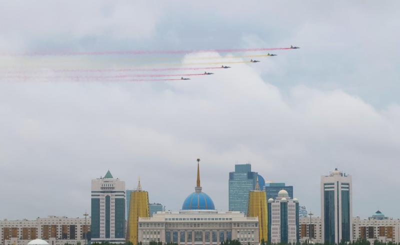 习近平抵达哈萨克斯坦总统府时,六架哈萨克斯坦空军战机从总统府上空飞过,拉出象征中国国旗的红黄色彩烟。