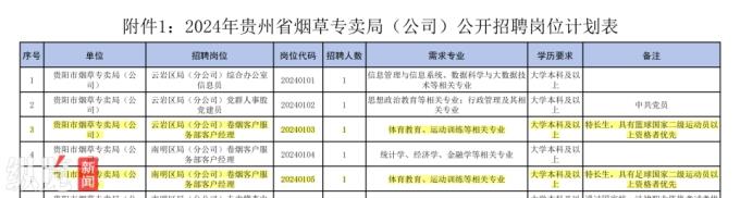 纵览新闻记者查询了贵州省烟草专卖局门户网站,据其5月11日发布的2024年贵州省烟草专卖局(公司)公开招聘岗位计划表,贵阳市烟草专卖局(公司)南明区局(分公司)的卷烟客户服务部客户经理岗位的需求专业确实为体育教育、运动训练等相关专业,备注则是特长生,具有足球国家二级运动员以上资格者优先。云岩区局(分公司)的客户经理岗要求也类似,只是备注为具有篮球国家二级运动员以上资格者优先。两个岗位的招聘人数都为1人。