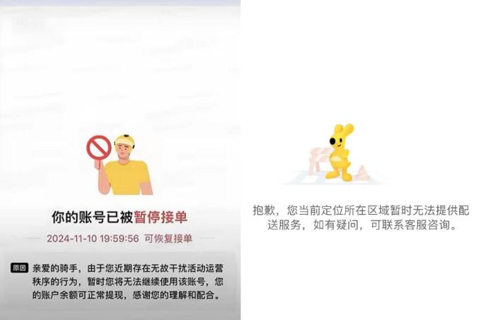 外卖员在园区聚集抗议期间,有消息称现场骑手被集体封号、无法接单。骑手晒出的截图显示,美团外卖平台的骑手页面跳出通知:“由于您近期存在无故干扰活动运营秩序的行为,暂时无法继续使用该账号。”