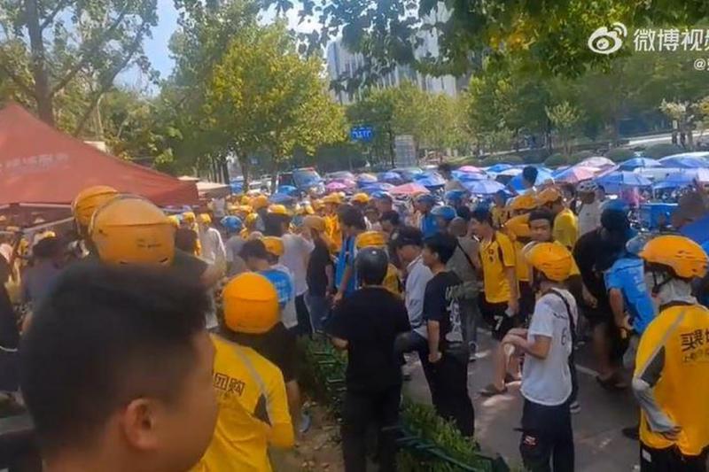 星期一(8月12日)下午,数百名外卖骑手聚集在浙江杭州西溪世纪中心园区外,高喊口号。盛夏午后的温度,都不及人群的怒气高涨。