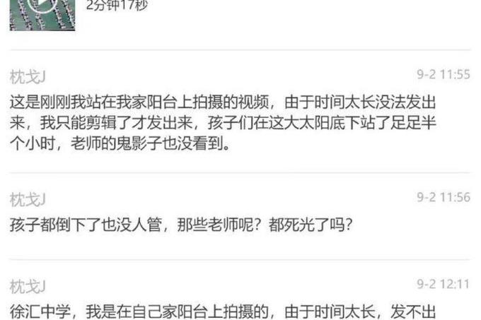 上海在9月2日当天发布高温预警,学校不仅没有采取延迟开学等防暑措施,反而让学生在烈日下罚站,也被人诟病。有人说,画面中的成年女子全身都包得严严实实,男老师甚至不在现场,只有十几岁的孩子在受酷暑折磨,体育课不该这么上。