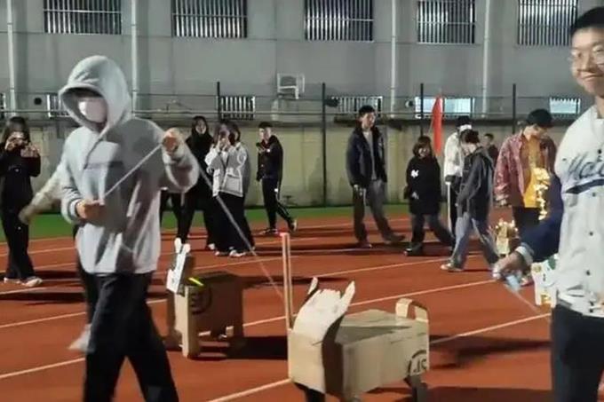 不久后,纸盒狗红遍校园,不少大学生以废旧纸盒制成宠物狗,有的把它们拴在宿舍门口,有的带去操场“遛狗”。