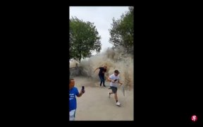 9月22日拍摄的视频显示,一群游客在杭州观看著名的钱塘江大潮时,一个巨大潮水突然向岸边卷来,游客见状后仓皇逃离,其中一名男子还因反应不及被袭来的潮水拍倒,所幸没有人员被潮水卷走。