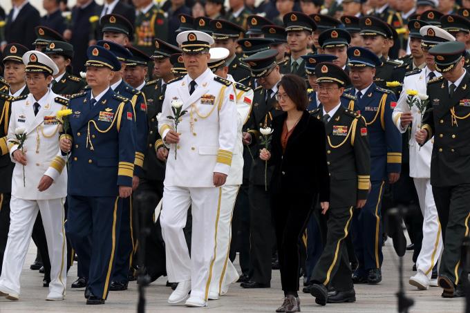 中国国防部长董军(前排左三)和中国军方其他成员持花出席烈士纪念日向人民英雄敬献花篮仪式。(路透社)