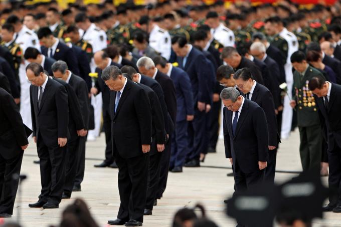 习近平等中共和中国国家领导人和其他出席者在仪式上默哀。(路透社)