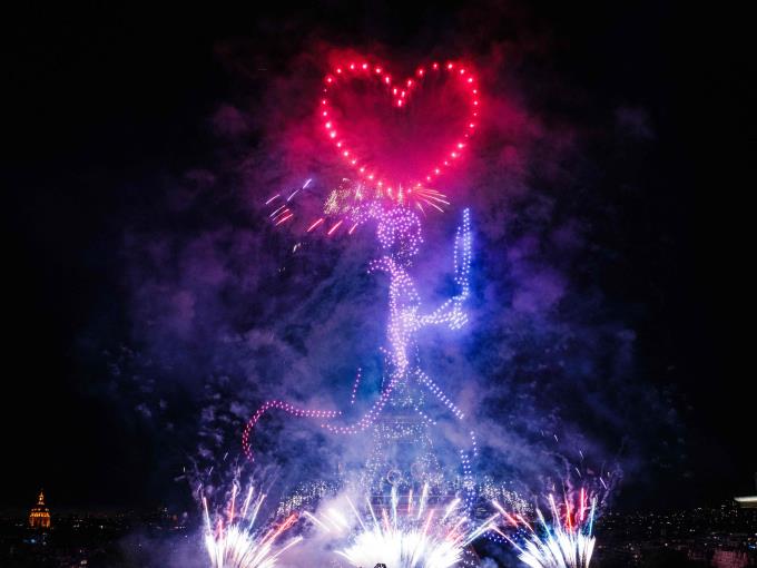 今年7月14日法国国庆日之夜,也是奥运火炬抵达巴黎同一天,1100架无人机在巴黎地标建筑——埃菲尔铁塔旁腾空而起,在夜幕里变幻出五环、火炬手、运动员等图案,并绽放出流光溢彩的光影焰火,为当月26日开幕的巴黎奥运会提前造势。