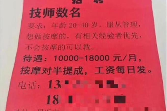 在云南财经大学9月27日举行的毕业生招聘会上,一家足浴养生会所贴出招聘广告,显示公司招聘数名按摩技师,岗位要求年龄在20岁至40岁,有按摩经验的优先考虑,不会按摩的可以教。网传照片显示,这份工作的工资每月1万元(人民币,下同,1830新元)至1万8000元,按摩对半提成,工资每日发。