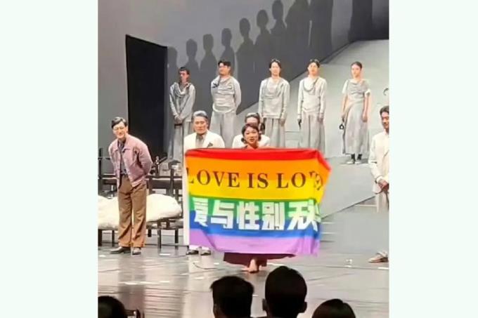 网传视频显示,金星今年1月在太原演出《日出》谢幕时,突然走到台前从一名男子手里拿过一面彩虹旗,并正对着观众向他们展示上面的字样:“Love is love(爱就是爱),爱与性别无关”,随后她把彩虹旗扔到身后,继续带领其他演员完成谢幕。