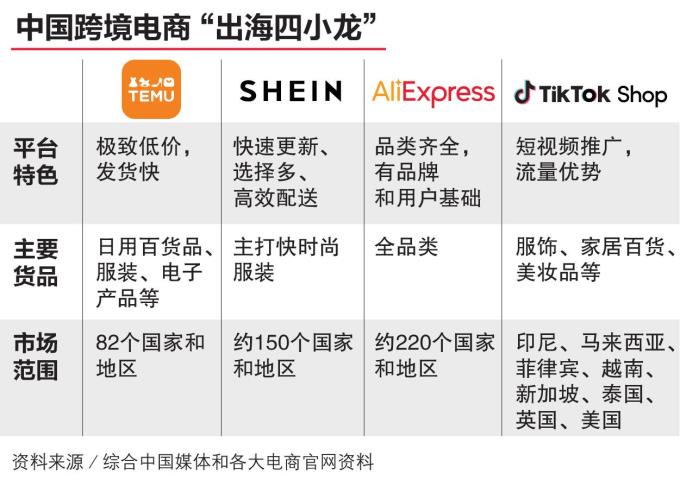 中国电商巨头拼多多旗下的跨境电商平台Temu,连同快时尚电商平台希音(Shein)、阿里巴巴旗下的速卖通(AliExpress)以及字节跳动旗下的TikTok Shop,被中国电商界称为“出海四小龙”。