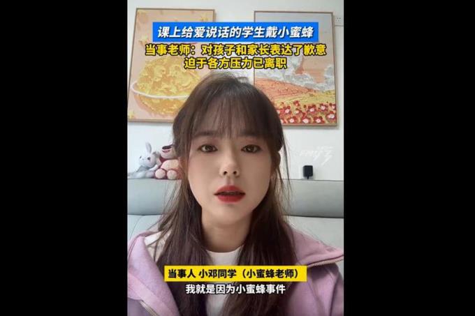 据上游新闻报道,邓老师离职视频中出现的一张原视频截图,其中隐约可以看到一名身穿深色校服的小学生,旁边坐着一名穿红色毛衣的同学。有网民指出,视频与山东某小学发布的“小蜜蜂”管理学生视频有相似之处。