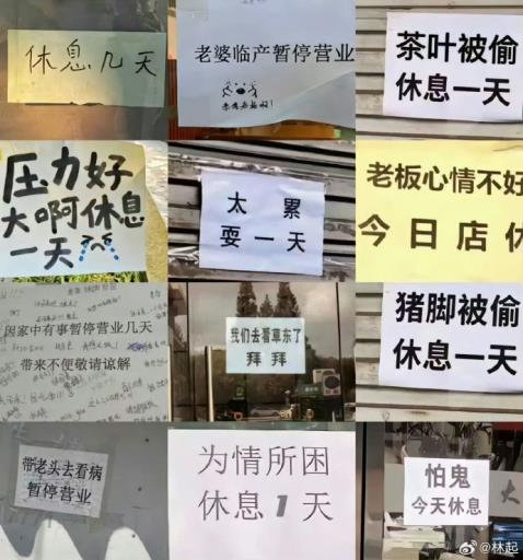 林起也在贴文中附上多张疑似商户发出的停业公告,停业原因五花八门,幽默之余还带有点无奈:“茶叶被偷,休息一天”“怕鬼,今天休息”“夫妻吵架休息一天,没有哄好再休一天。”