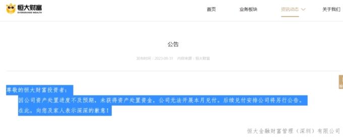 2023年8月31日,恒大财富微信公众号发文称,因公司资产处置进度不及预期,未获得资产处置资金,公司无法开展本月兑付。后续兑付安排公司将另行公告。