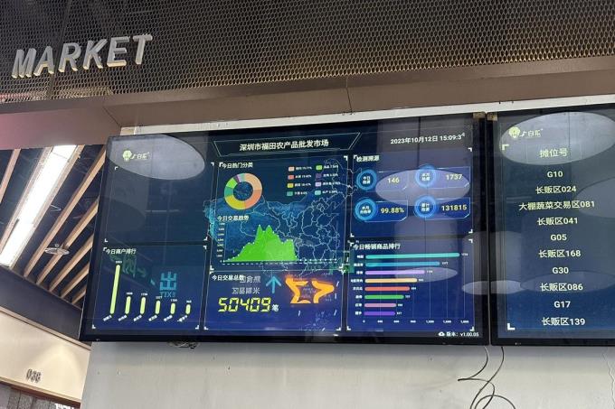 深圳福田农批市场大门口,墙上的显示屏滚动显示着各种图表和数据,各式各样农产品的均价、交易量等实时数据,为商户和消费者提供精准参考,提升市场透明度,让传统的菜市场迈向智慧化。