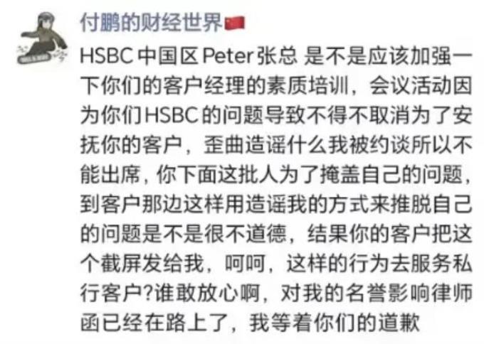 网上还流传一份通知显示,原定于11月30日在杭州康莱德酒店举行的汇丰“汇眼观天下闭门分享活动”因主讲嘉宾付鹏无法出席而取消,疑似汇丰银行员工称付鹏“因为被监管约谈了临时来不了”。