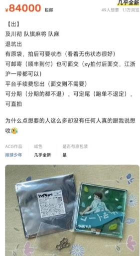 今年,一块日本漫画《排球少年》里西谷夕角色的徽章,在二手平台上被炒到7万2000元,因据传这款徽章全球限量五枚。另一枚同款动漫里及川彻角色的“队旗麻将”被炒到8万4000元,交易平台显示浏览量有1万1000人次,显示谷子经济的火爆程度。