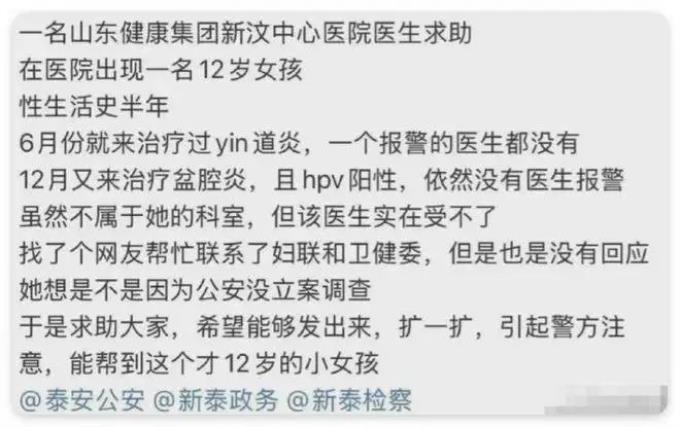 有博主当天发贴称,一名山东颐养健康集团新汶中心医院的医生向自己求助帮忙报警,指医院出现一名有半年性生活史,并感染HPV的12岁女孩。