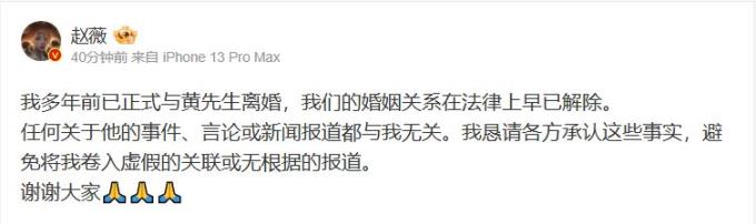 她发文说:“我多年前已正式与黄先生离婚,我们的婚姻关系在法律上早已解除。任何关于他的事件、言论或新闻报道都与我无关。我恳请各方承认这些事实,避免将我卷入虚假的关联或无根据的报道。谢谢大家。”