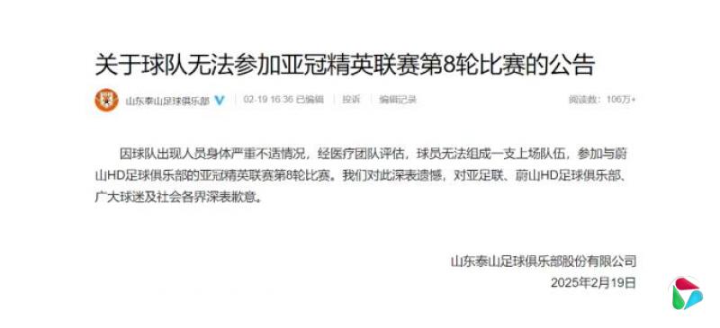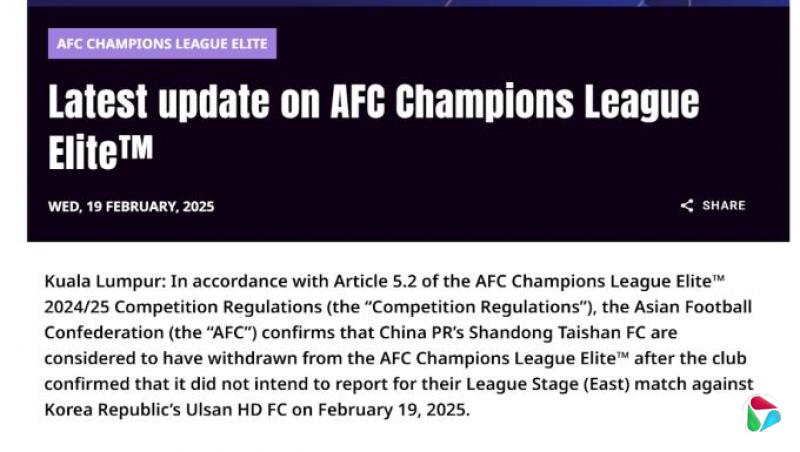亚洲足球联合会(简称亚足联)2月19日在官网发布公告,称根据亚足联冠军精英联赛2024/2025竞赛规程第五条第二款规定,亚足联确认,中国山东泰山足球俱乐部确认不打算在当天对阵韩国蔚山HD足球俱乐部的比赛报到后,“山东泰山足球俱乐部被视为退出亚足联冠军精英联赛”。